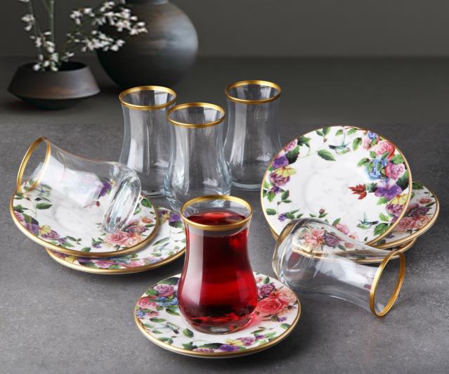6 Adet Çay Bardağı (160cc), 6 Adet Seramik Çay Tabağı (Çap:12cm)